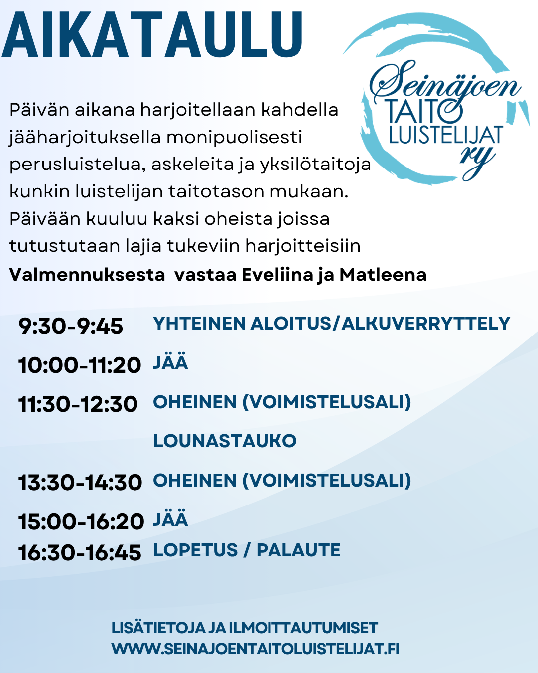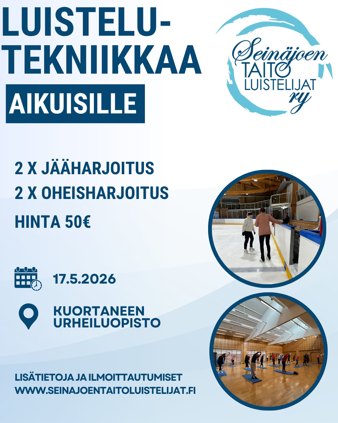 Ilmoittautuminen käynnissä! Otamme uusia luistelijoita esimerkiksi luistelukouluun, koululaisten harrastajaryhmään JääTaitureihin  ja aikuisten Skate Fit & Skills tunneille (ent.kuntoluisteluun).